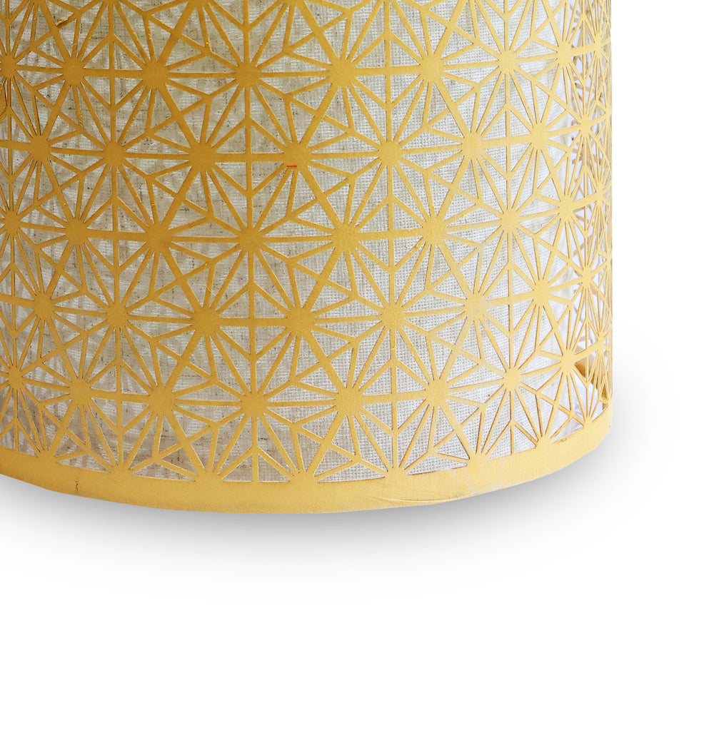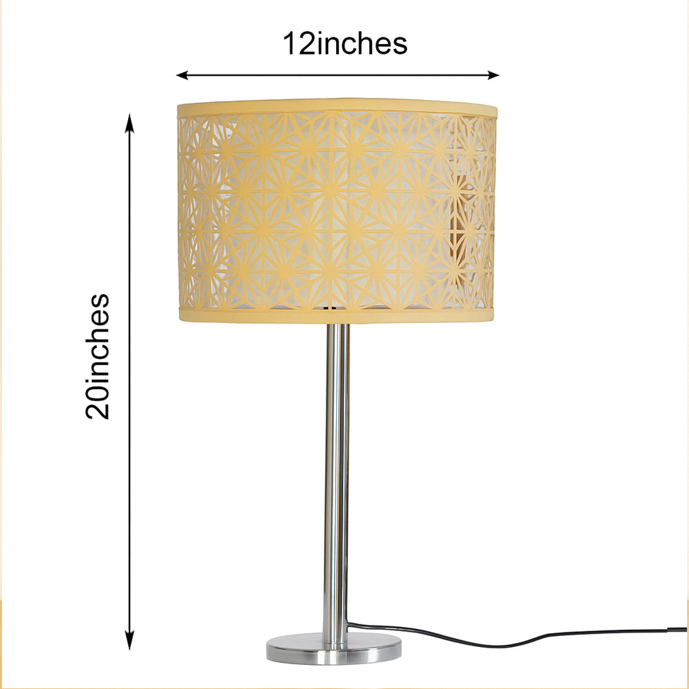 Elevate your interiors with this modern geometric table lamp—a striking blend of artistry and functionality. The lamp features a sleek stainless-steel base paired with a fabric shade wrapped in intricate cutwork detailing, inspired by geometric star patterns. Its bold design casts captivating shadows, creating a statement piece for any space.