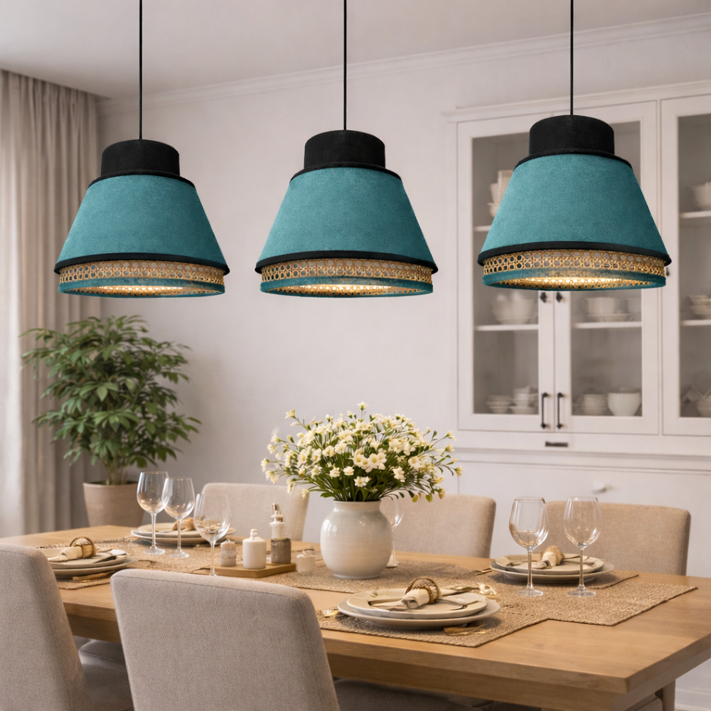 Bring sophistication into your interiors with this Teal Rattan pendant lamp. Designed with bold color Velvet fabric shade enhanced by a handwoven rattan band at the base, adding natural charm to its modern form.