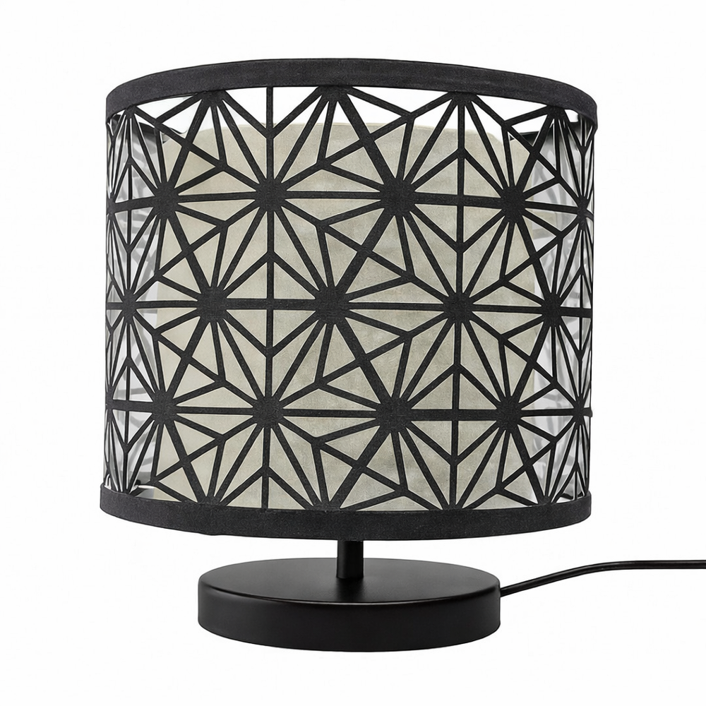 The outer surface features a refined framework with an intricate repeating geometric lattice. When lit, the warm inner fabric glows gently through the pattern, creating a layered visual effect — both architectural and soothing. This dual-tone interaction ensures the lamp looks premium even when switched off, and becomes atmospheric once illuminated.