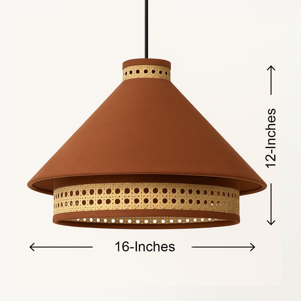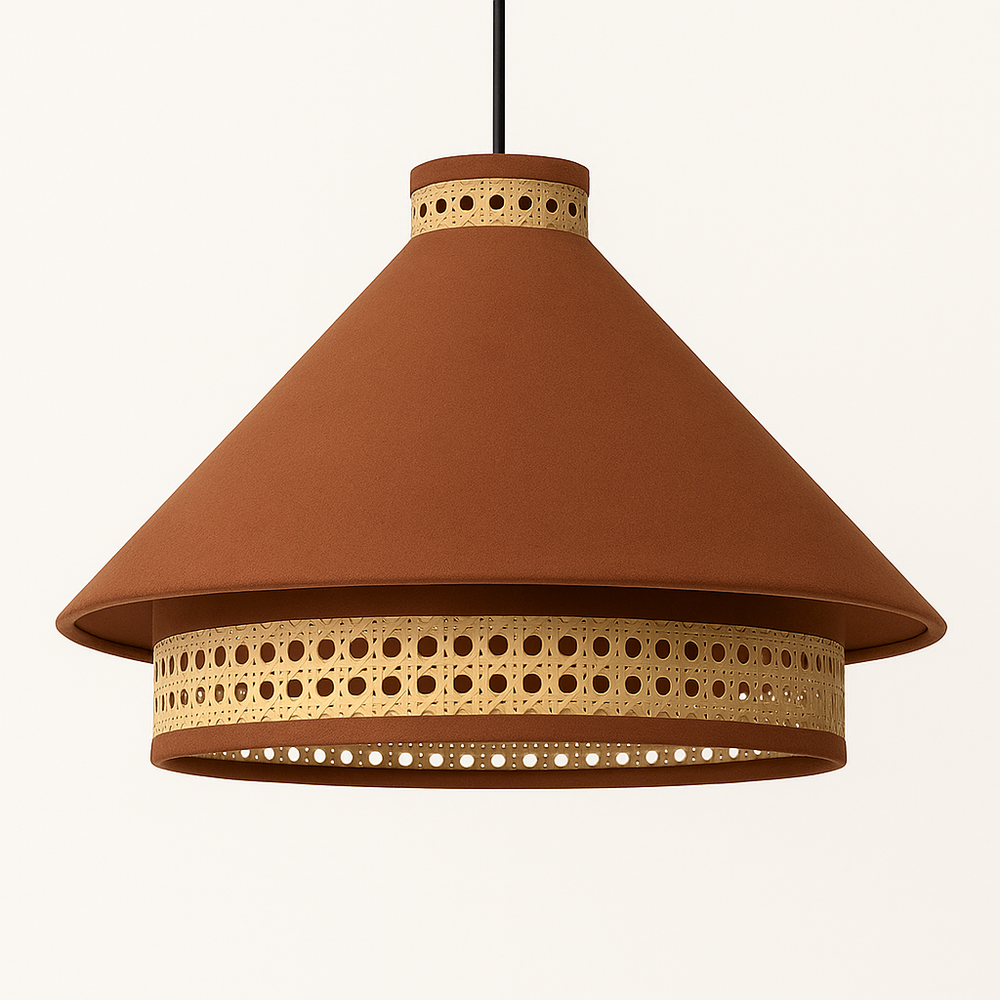 This is a handcrafted pendant lampshade featuring a conical Brown fabric body paired with natural rattan weave detailing at both the top and bottom edges. The earthy Brown tone of the fabric complements the organic rattan texture, giving it a balanced mix of modern and rustic aesthetics.