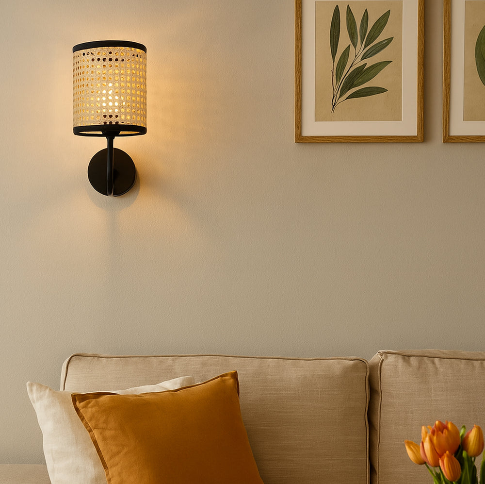 Lampshade: The shade is made from woven natural rattan in a hexagonal cane weave pattern. This open-weave style creates a warm and organic texture that diffuses light softly.