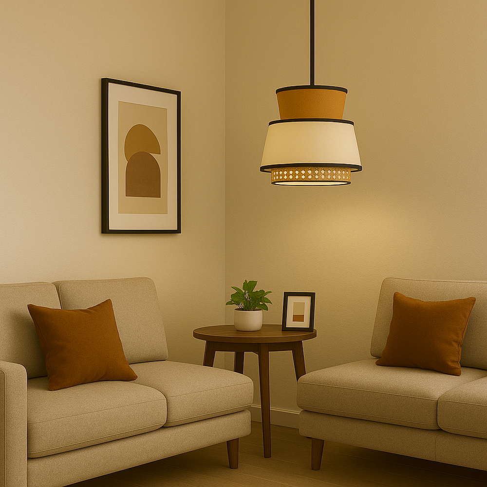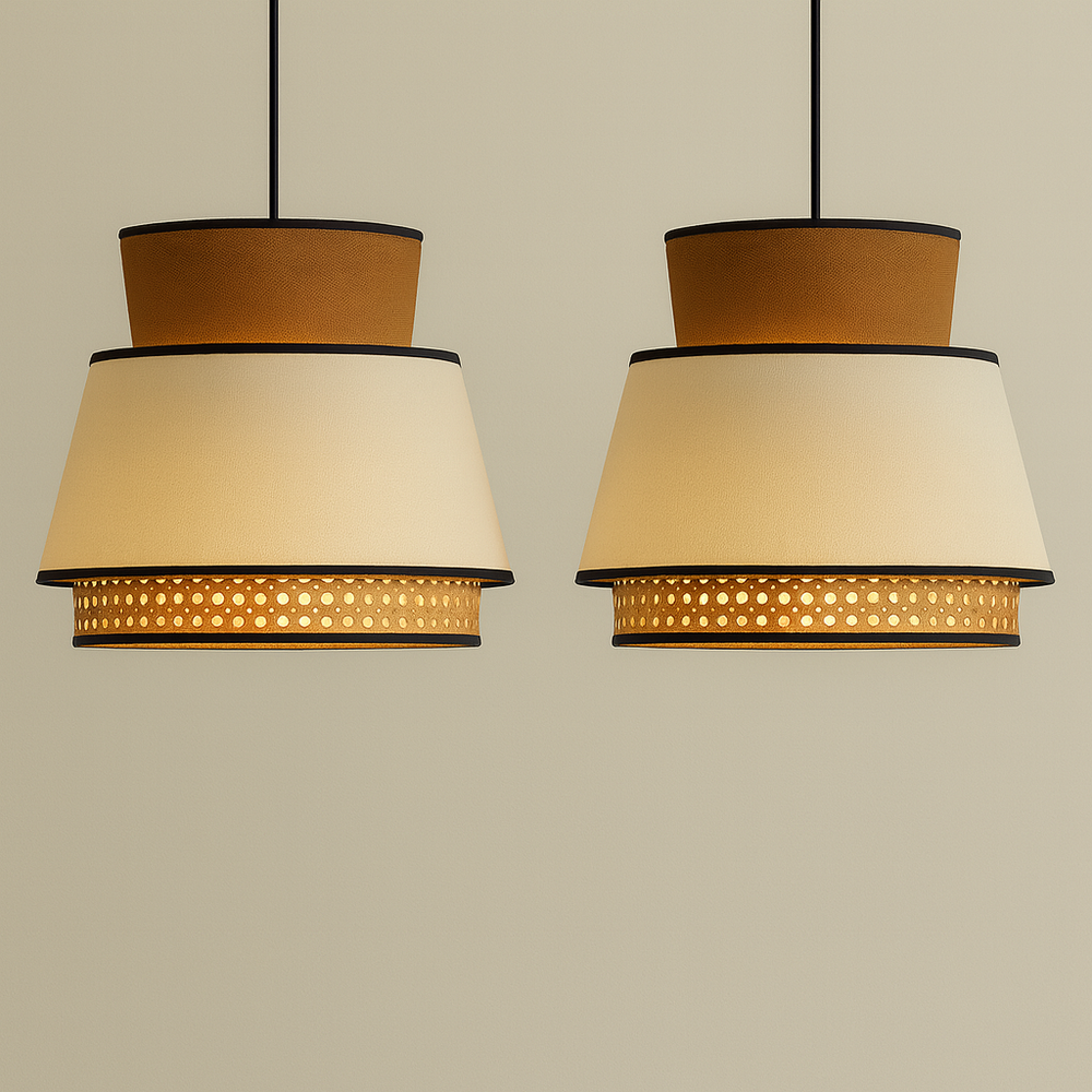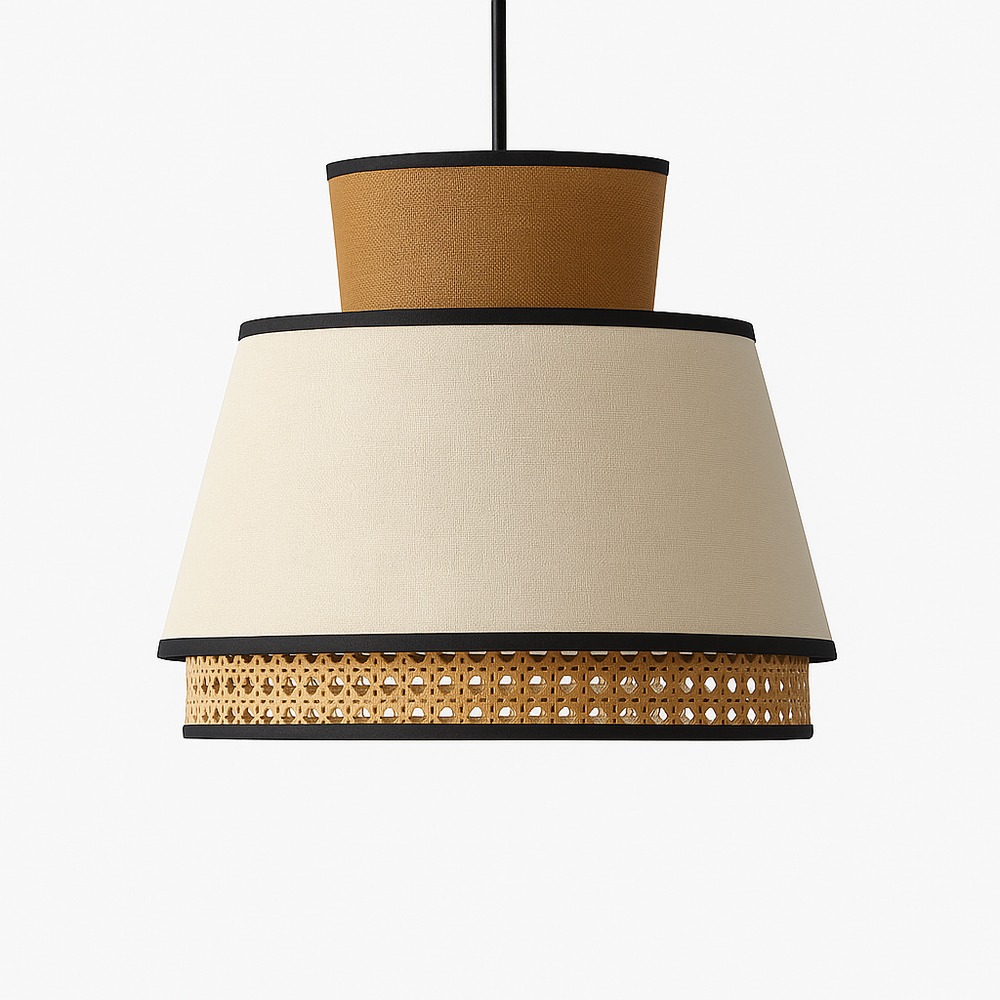 Add depth and elegance to your interiors with this layered pendant lamp, designed with a unique two-tone fabric shade and a handwoven rattan detail at the base. Its tiered silhouette creates a striking focal point while diffusing warm, ambient light that enhances any space.