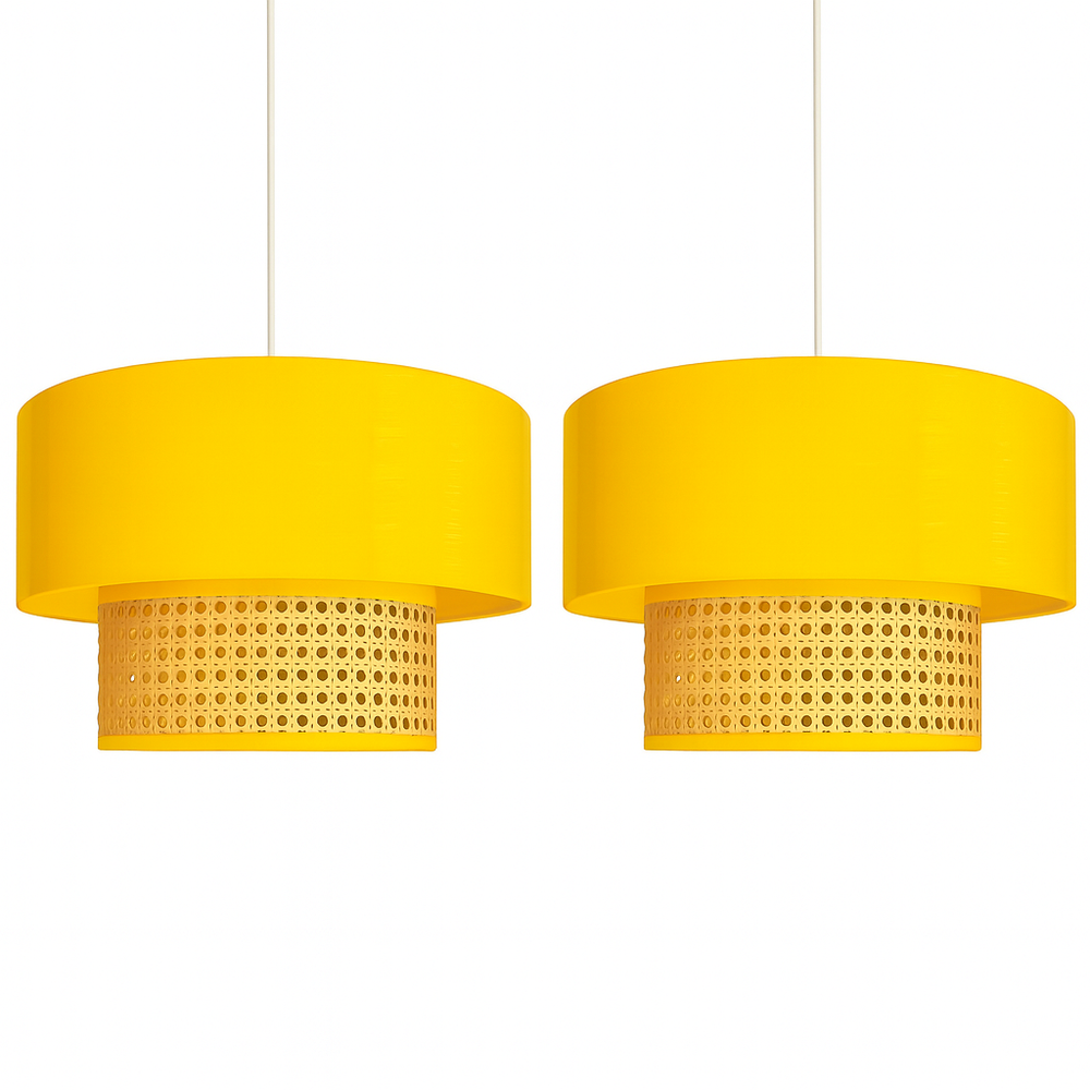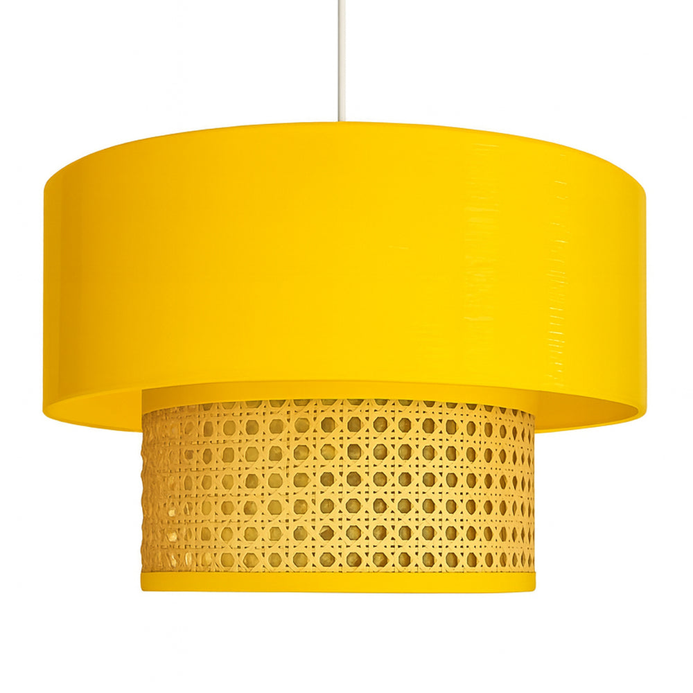 Add a burst of joy to your interiors with this sunshine yellow pendant lamp, designed to bring energy and warmth into any space. The bold yellow fabric shade is paired with a handwoven rattan insert, creating a unique balance of contemporary flair and natural texture.